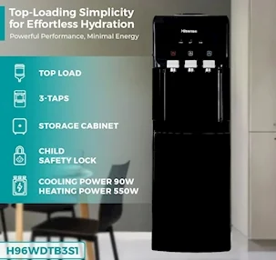 The Hisense H96WDTB3S1 is a versatile top-load water dispenser designed for home or office use. It combines a 3.4L water dispenser with a built-in refrigerator cabinet, providing instant hot, cold, and normal temperature water at the push of a button in a sleek black finish.