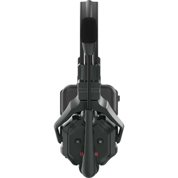 The headsets pair up automatically, and tactile volume buttons allow for fast adjustments—making the system easy to operate. The microphone boom on each headset rotates 360°, allowing for left or right orientation. Rotating the boom arm up or down conveniently mutes the mic when not in use. An LED indicates the system is working and warns you when the battery is low.