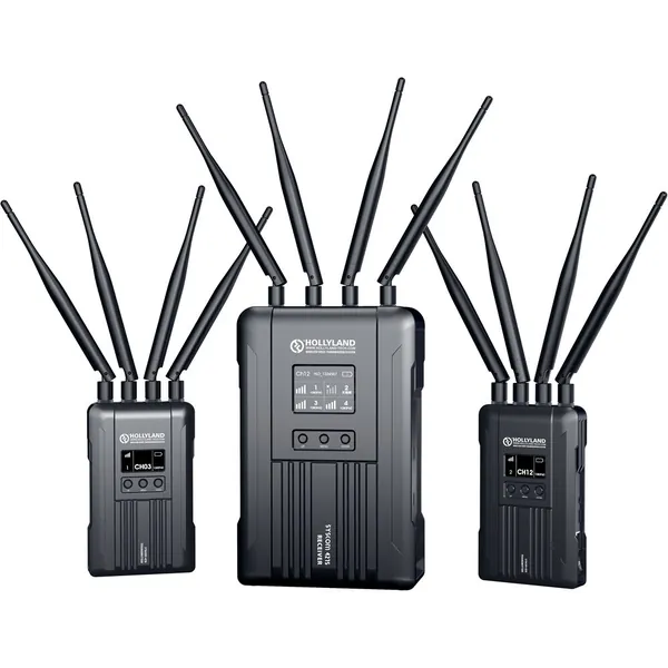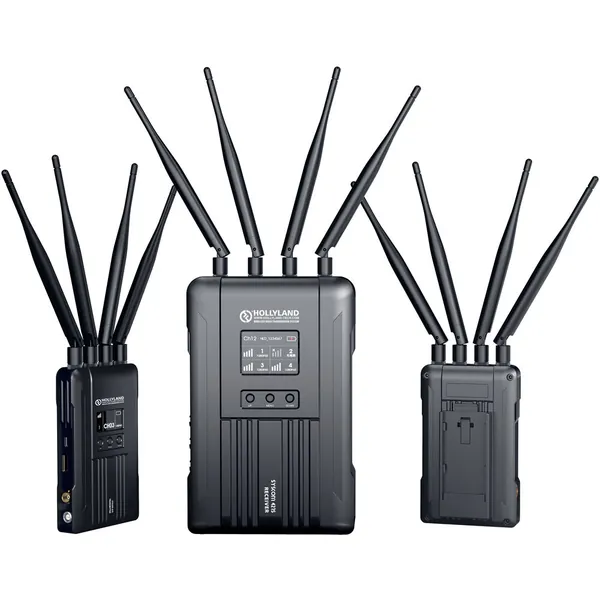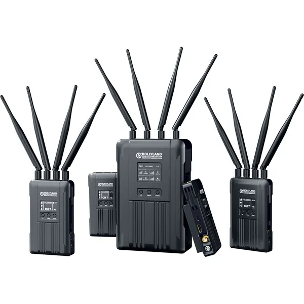 The Syscom 421S 4-Transmitter 1800' A/V Transmission System with Carry Case from Hollyland is a multi-cam wireless video transmission system that communicates with up to four cameras using a single receiver with PTZ control as well as tally. Supporting up to 1080p60 video signals via SDI and HDMI, the transmitter/receiver system offers an 1800' line-of-sight transmission range with 0.07 second latency. The 421S system also supports Ethernet pass-through, so you can stream directly via RTSP to the Internet.