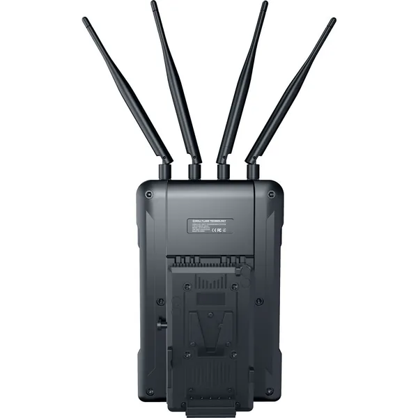 The receiver features four SDI and four HDMI outputs (one for each transmitter) for connecting to a monitor or switcher. You can control PTZ cameras via IP or RS-422/485 serial connections. The transmitters have a dedicated tally output port that support optional tally lights. Both units also have an OLED display that confirms the resolution, transmission channel, signal strength, and other details such as battery power. Each transmitter has an L-series battery plate, and the receiver has a V-mount battery plate. Both Transmitters and receiver also feature a 2-pin power input for alternate DC power options.