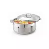 Double walled stainless steel casserole with insulated lid keeps food hot and fresh for hours Attractive casserole make mealtimes fun and exciting. Integrated side-handles allow easy to carry from kitchen to dining table with an eye catching design featuring stainless steel casserole Made from durable quality steel, the functional and leak proof lid of the casseroles with an Integrated side-handles allow easy grip which can be opened or shut with a simple motion and trap the heat effectively inside the casserole or hot pot The perfect serving casserole for any special occasions or household like birthday or anniversary parties, holiday, picnic will keep your Soup, Salads, chappati, Roti or any beverages hot and fresh for long hours Enhance the look of your dining table with its exclusive shape and design. Color: Silver, Material: Stainless Steel. Package Contents: 3 - Piece Size - Esteelo Crysta 2000/3000/4000