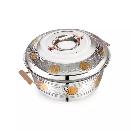 Double walled stainless steel casserole with insulated lid keeps food hot and fresh for hours Attractive casserole make mealtimes fun and exciting. Integrated side-handles allow easy to carry from kitchen to dining table with an eye catching design featuring stainless steel casserole Made from durable quality steel, the functional and leak proof lid of the casseroles with an Integrated side-handles allow easy grip which can be opened or shut with a simple motion and trap the heat effectively inside the casserole or hot pot The perfect serving casserole for any special occasions or household like birthday or anniversary parties, holiday, picnic will keep your Soup, Salads, chappati, Roti or any beverages hot and fresh for long hours Enhance the look of your dining table with its exclusive shape and design. Color: Silver, Material: Stainless Steel. Package Contents: 3 - Piece Size Queen Flower 3000/4000/6000