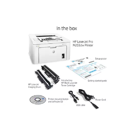 HP LaserJet Pro Monochrome Printer Wireless M203dw Get more pages, performance, and protection from a wireless HP LaserJet Pro powered by JetIntelligence Toner cartridges. Set a faster pace for your business: Print two-sided documents right away, and easily manage them to help maximize efficiency. Ideal for small businesses that want professional two-sided documents from a wireless printer that's easy to manage to help maximize efficiency. Key Features: Fast printing, low energy use Print at the pace of business—this printer is equipped with fast two-sided printing. Grab the documents you need and go. Print the first pages in as fast as 7 seconds. Help save energy with HP Auto-On/Auto-Off Technology. Mobile printing made simple Get a simple setup, and print and scan from your phone, with the HP Smart app. Easily print from a variety of smartphones and tablets. Print with the ease of sending an email, right from a smartphone, tablet, or notebook, using HP ePrint.HP Voice-activated printing—your HP printer works with Amazon Alexa, Google Assistant, and Microsoft Cortana. Manage company-wide printing with confidence Centralize control of your printing environment with HP Web Jetadmin—and help build business efficiency.Identify new devices and gain insight into printing with HP Web Jetadmin remote discovery and monitoring.Employ policy-based, fleet-wide protection features, using the optional HP JetAdvantage Security Manager. HP quality—print after print Produce sharp text, bold blacks, and crisp graphics with precision black toner. Don’t be fooled by alternatives that mimic Original HP. Help ensure you’re getting the quality you paid for. Print over 2x more pages than standard cartridges, using optional Original HP high-yield toner cartridges.Get more pages than ever before,and track the remaining pages to help ensure you get what you paid for. Specifications: Product naming Model name: HP LaserJet Pro M203dw Printer Product number: G3Q47A What's included and accessories What's in the box: HP LaserJet Pro M203dw Printer; HP Black LaserJet Toner Starter Cartridge; HP LaserJet Imaging Drum; Setup Poster; Warranty Guide; Printer documentation and software on CD-ROM; Software drivers and documentation on CD-ROMs; Power cord; USB cable Connectivity Ports: 1 Hi-Speed USB 2.0; 1 Ethernet 10/100 network; Wireless Wireless capability: Yes, built-in Wi-Fi 802.11b/g/n Storage device and direct print support: Wi-Fi Direct Environmental Acoustic power emissions: 6.6 B(A) Operating humidity range: 30 to 70% RH Storage humidity: 10 to 90% RH Recommended operating temperature range (Celsius): 17.5 to 25ºC Recommended operating temperature range (Fahrenheit): 63.5 to 77ºF Storage temperature range (Celsius): -20 to 60ºC Storage temperature range (Fahrenheit): -4 to 140ºF Environmental specifications: Mercury-free Memory Memory, standard: 256 MB Mobile printing capability Mobile printing services: HP ePrint; Wi-Fi Directprinting; AirPrint1.5 with media presence sensor; Google Cloud Print 2.0 Networking Network protocols, supported: TCP/IP: IPv4; IPv6; IP Direct Mode; LPD; SLP; Bonjour; WS-Discovery; BOOTP/ DHCP/ AutoIP; WINS; SNMP v 1/2/3; and HTTP/HTTPS Paper handling Input capacity: Up to 250 sheets Input capacity, priority tray(envelopes): Up to 10 Output capacity: Up to 150 sheets Media sizes supported (metric): A4; Media sizes supported (U.S. standard): Letter; Legal Media sizes, custom (metric): 76 x 127 to 216 x 356 mm Media sizes, custom (U.S. standard): 3 x 5 to 8.5 x 14 in Media types: Paper (laser, plain, photo, rough, vellum), envelopes, labels, cardstock, postcards Media weight supported (metric): 60 to 163 g/m² Media weight supported (U.S. standard): 16 to 43 lb Paper handling - duplexer Recommended media weight, duplex (metric): 60 to 105 g/m² Recommended media weight, duplex (U.S. standard): 16 to 28 lb Media sizes, duplex (metric): A4 Media sizes, duplex (U.S. standard): Letter; Legal Physical dimensions Maximum dimensions (W x D x H, metric): 370.5 x 407.4 x 223.9 mm Maximum dimensions (W x D x H, U.S. standard): 14.6 x 16 x 8.8 in Weight (metric): 6.9 kg Weight (U.S. standard): 15.2 lb Power Energy savings feature technology: HP Auto-on/Auto-off Technology Power supply type: Internal Power supply: 110-volt input voltage: 110 to 127 VAC (+/- 10%), 60 Hz/50 Hz, 5.4 A; 220-volt input voltage: 220 to 240 VAC (+/- 10%), 60 Hz/50 Hz, 3.1 A Power consumption: 480 watts (active printing), 1.9 watts (ready), 0.5 watts (sleep), 0.8 watts (Auto Off/Wake on USB, enabled at shipment), 0.05 watts (Auto-off/Manual-on), 0.05 watts (Manual Off) Print cartridges Number of print cartridges: 1 Black cartridge, 1 drum Replacement cartridges: HP 30A Original Black LaserJet Toner Cartridge CF230A; HP 30X Original Black LaserJet Toner Cartridge CF230X; HP 32A Original LaserJet Imaging Drum CF232A Printing specifications Print technology: Laser Duplex printing: Automatic (standard) Print resolution (best): Up to 1200 x 1200 dpi Monthly duty cycle: Up to 30,000 pages Print languages: PCL5c; PCL6; PS; PCLm; PDF; URF; PWG Printer smart software features: AirPrint1.5 with a media presence sensor, Instant-on Technology, HP Auto-On/Auto-Off Technology, JetIntelligence cartridges, Mopria-certified, Wi-Fi Direct printing, Duplex printing Regulatory specifications Regulatory model number: SHNGC-1502-01 Energy efficiency: ENERGY STAR certified; Blue Angel; EPEAT (Silver) Safety: IEC 60950-1:2005 +A1:2009+A2:2013/EN60950-1:2006 +A11:2009 +A1:2010+A12:2011+A2:2013; IEC 60825-1:2007 / EN 60825-1:2007 (Class 1 Laser/LED Product); IEC 62479:2010 / EN 62479:2010; GB4943-2011 Electromagnetic compatibility: CISPR 22:2008 / EN 55022:2010 - Class B, EN 61000-3-2:2006 +A1:2009 +A2:2009, EN 61000-3-3:2013, EN 55024:2010, FCC Title 47 CFR, Part 15 Class B / ICES-003, Issue 6, GB9254-2008, GB17625.1-2012 Security Security management: Password-protected network embedded Web server; enable/disable Network ports; SNMPv1 co