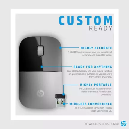 It’s time your accessories matched your individuality. Meet your new wireless mouse, carefully crafted to bring its unique slim style to your work. It’s functional. It’s portable. It’s fashionable. It’s yours. Designed with flair The sleek design complements your favorite HP devices, and fits comfortably anywhere. Wireless convenience The 2.4 GHz wireless connection reliably keeps you hooked up. Battery life that lasts With up to 16 months of life on a single AA battery, this mouse was designed to push the limits. TECHNICAL DETAILS Connection Type: 2.4 GHz wireless connection Wireless Range: Up to 32.81 ft in open area Sensor Technology: Multi surface tracking Sensor resolution: Up to 1200 dpi Buttons: 3 Advanced Scroll: Wheel Normal Battery: 1 x AA Battery life: Up to 16 months Indicator Light Battery Compatible operating systems: Windows 7; Windows 11; Windows 10; Windows 8; macOS; Chrome OS™ What's in the box: HP Wireless Mouse Z3700; Dongle; 1 AA battery; Quick Start Guide; Product notices; Warranty card Compatibility: Compatible with HP PCs with available USB port. Dimensions (W X D X H): 3.98 x 2.37 x 1 in Weight: 0.11 lb Warranty One-year limited warranty.