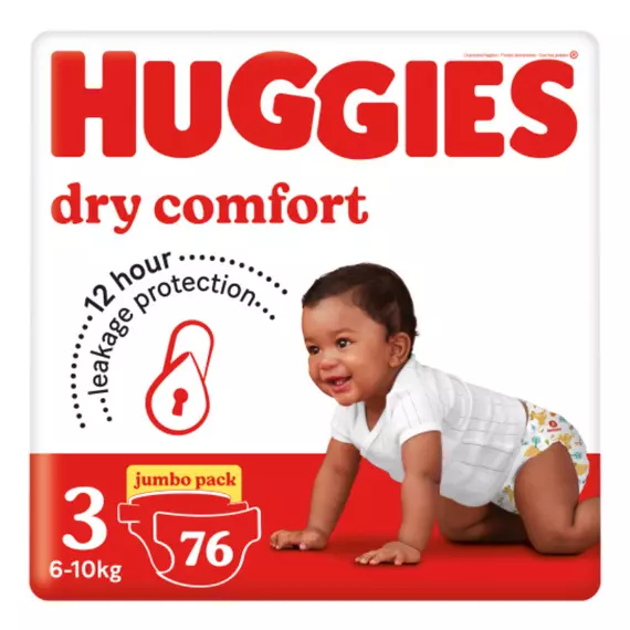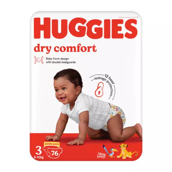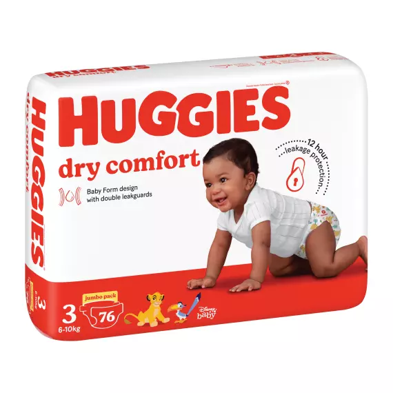 Huggies Dry Comfort Disposable Nappies Jumbo Pack Midi are designed with a powerful lock-gel core that draws away liquid quickly to keep your little one dry for up to 12 hours. These nappies also feature a leak-guard waistband and resealable fasteners.12 Hours Leakage Protection Baby form design with double leak guards Stretchy Leak guard Waistband Super Absorbent Lockgel Core Improved resealable fasteners Disney characters with new one-of-a-kind Lion King graphics Packaging contains 30% recycled plastic