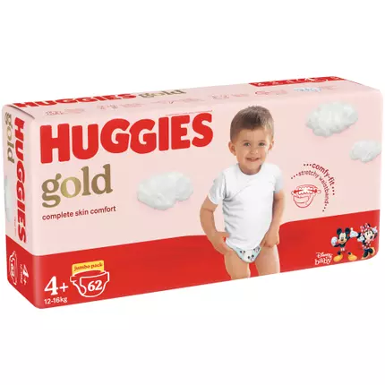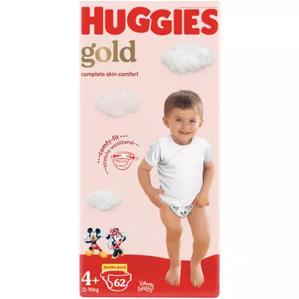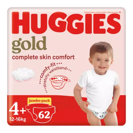 Huggies Gold Disposable Unisex Jumbo Pack Size 4+ Size 4+ is packed with 62 nappies, now with Intelligent Fit for a better, secure fit. Active channels absorb wetness and distribute it evenly to prevent sagging and leakages. Stretching waistbands and leg openings give your baby the most comfortable fit possible. Made to fit babies weighing 12-16kg.
