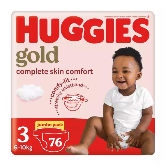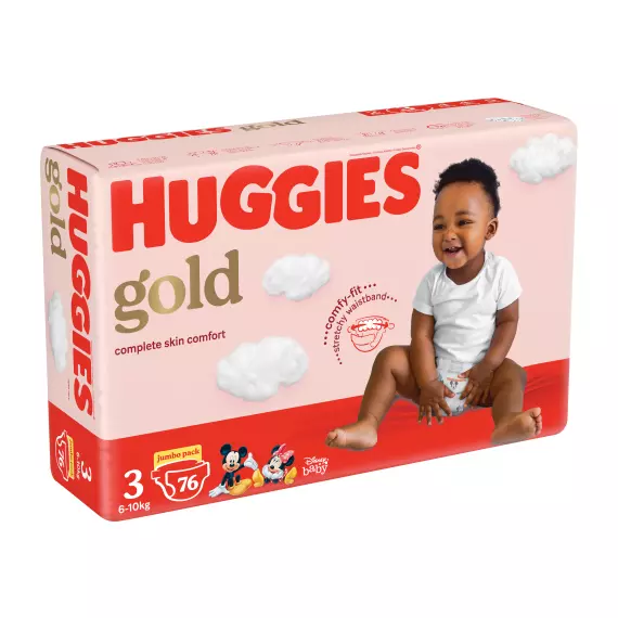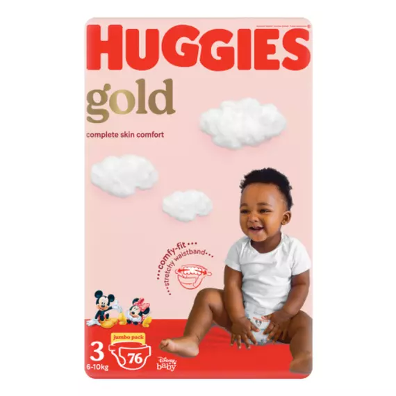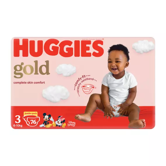 Huggies Gold Disposable Nappies Junior Pack Size 3 76 Nappies are especially designed with the needs of little ones in mind. Made with special DryTouch liners, these nappies absorb wetness and draw it into the nappy within seconds. The flexible waistband and elasticity around the legs keeps baby comfortable all day long. Active channels that absorb wetness & distribute it evenly Reduced sagging even when getting full Stretchy waistband & fasteners for a comfy fit Anatomical shape for a better fit With Disney's Mickey & Minnie characters.Huggies® Gold nappies are anatomically shaped to fit comfortably and feature the much-loved stretchy waistband and fasteners that allow you to secure the nappy snugly and comfy on your baby. Huggies® Gold also includes 3 Active Channels that absorb wetness and distribute it evenly, reducing sagging and decreasing the bulkiness leading to more comfort for baby. Huggies® Gold is available in Pants, try them out today!