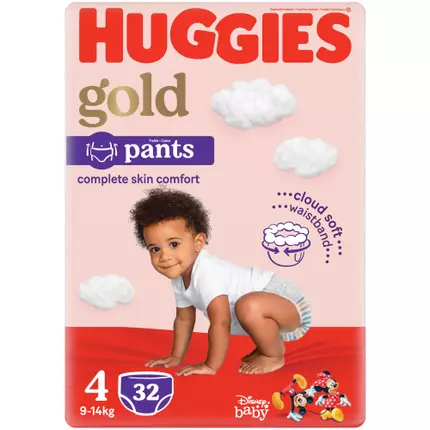 Huggies Pants Disposable Pants Unisex Size 4 32 are an innovative alternative to regular open nappies that are designed to fit babies from the moment they start to wriggle and move around until they no longer need nappies. They are as absorbent as your regular open nappy, but are uniquely designed to fit like underwear; giving babies the freedom to wriggle, crawl, climb and roll more easily, enabling them to explore to their hearts’ content. The all-round soft and stretchy waistband prevents the Nappy Pants from slipping down and the double leg elastic gently hugs baby’s legs for a secure fit to prevent leakage.