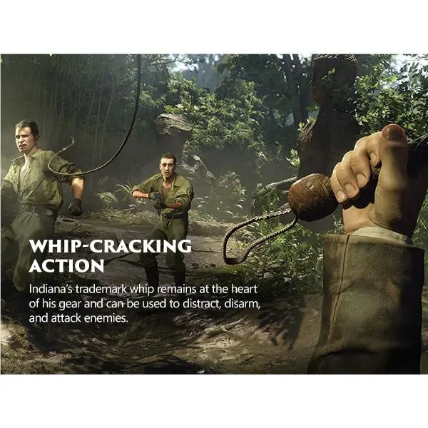 Indiana’s trademark whip remains at the heart of his gear and can be used to distract, disarm, and attack enemies. But the whip isn’t just a weapon, it’s Indy’s most valuable tool for navigating the environment. Swing over unsuspecting patrols and scale walls as you make your way through a striking world.