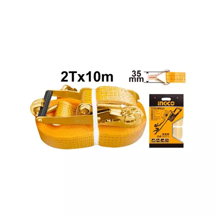 Specifications: Load: 2T Length: 10M Width: 35mm With ratchet and double j hooks Packed by straps