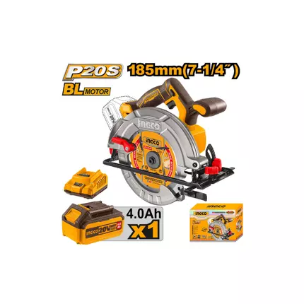 Specifications: Brand: Ingco Model: CSLI18511 Type: Circular Saw Brushless motor Voltage: 20V No-load speed: 4800rpm Blade diameter: 185mm(7-1/4'') Arbor size:20mm Cutting capacity: 45° degree: 45mm 90° degree: 65mm Adjustable cutting depth Adjustable bevel cutting Include: 1 Pcs 185mm saw blade 1 Pcs Hex key 1 Pcs 4.0Ah battery pack(FBLI20021) 1 Pcs charger(FCLI2001) Charge volts: 220-240V~50/60Hz Packed by color box