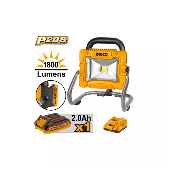 Powerful Illumination: Offers a high lumen output of 1800 lumens on the high setting and 900 lumens on the low setting, providing bright and adjustable lighting for various needs. Cordless Convenience: Powered by a 20V battery, making it portable and ideal for use in locations without access to a power outlet, whether indoors or outdoors. Efficient LED Technology: Utilizes 20W LED power dissipation for energy-efficient lighting that provides bright illumination while conserving battery life. Specifications: Brand: Ingco Model: CWLI2025 Type: Lamp Voltage:20V LED power dissipation:20W Lumens: High:1800 Low:900 Battery and charger sold separately Packed by color box