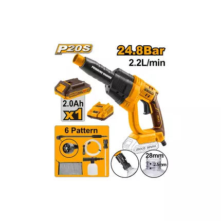 Specifications: Brand: Ingco Model: CPWLI20082 Type: Pressure Washer Voltage: 20V Max pressure: 24.8Bar Flow rate: 2.2L/min Auto stop system Charge volts: 220-240V~50/60Hz Packed by color box Include: 1 Set 6-pattern spray gun 1 Pcs 6m water inlet hose with quick connector 1 Pcs self suction connector 1 Pcs 400ml foam producer 1 Pcs portable bag 1 Pcs 2.0AH battery (FBLI2001) 1 Pcs fast charger (FCLI2001E)