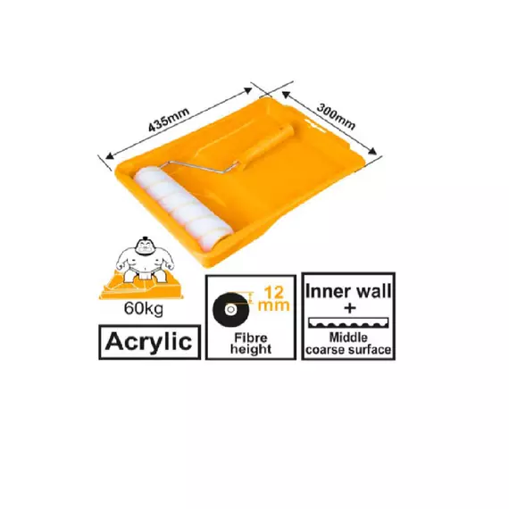 Specifications: Material: Acrylic Cylinder brush size: 230mm The bigger size roller cover Fiber height: 12mm Suitable for inner wall 6mm Central shank Paint tray size: 435 x 300 x 7.5mm Includes: 1 Piece 250mm paint tray 1 Piece acrylic cylinder brush