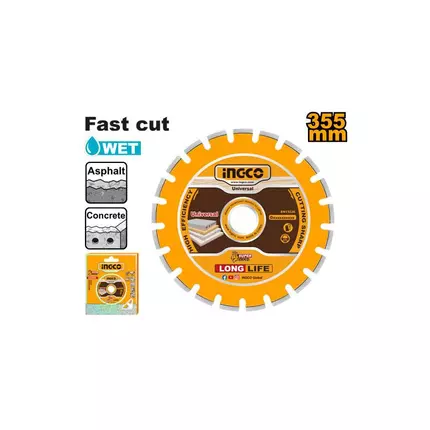 Specifications: Brand: Ingco Model: DMD033551 Type: Diamond Disc Size:355mm(14")X25.4mm Blade width:12mm Suitable for item PC3558 Packed by color box