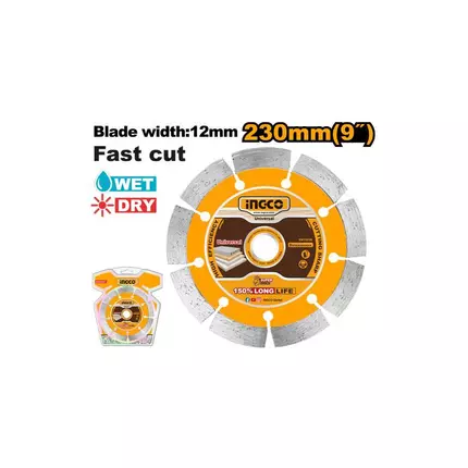 Specifications: Brand: Ingco Model: DMD012301 Type: Dry Diamond Disc Size:230(9"")X22.2mm Blade width:12mm Designed for stone cutting, including concrete, brick, limestone, granite and marble Suitable for both wet and dry cutting Packed by double blister