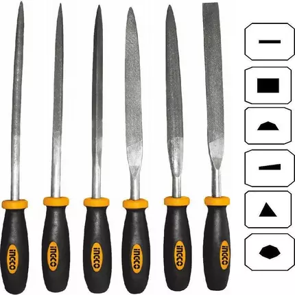 Features Ingco 6 Piece Needle File Set Variety of shapes, wide use, strong and durable Comfortable grip, precise and uniform, clear teeth Multi-Purpose Use For mahogany and other hardwood category timber processing professional file Application: Used for processing hard wood, metal, deburring, trimming, chamfering and polishing Rough machining Suitable for all kinds of wood grinding, metal, jewelry working making necessary model Specifications: Length : 5.5" / 140mm Diameter : 3mm Two color handle INCLUDES 1 Piece Flat file 1 Piece Round file 1 Piece Half round file 1 Piece Square file 1 Piece Triangle file 1 Piece Knife file