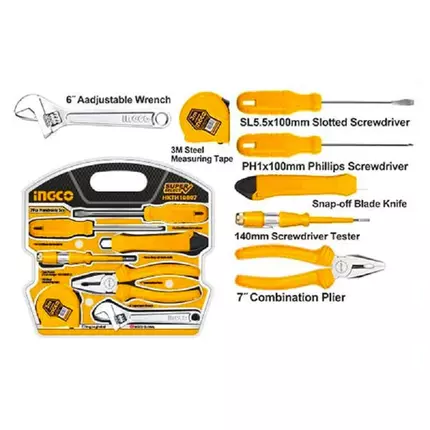 Specification: 1 pc 7″ combination pliers 1 pc Test Pencil (Test Voltage : 100-500V AC) 1 pc 6″ adjustable wrench 1 pc 9mm snap-off blade knife 1 pc SL5 5×100 screwdriver 1 pc PH1x100 screwdriver 1 pc 3M Steel measuring tape Packaged in blister