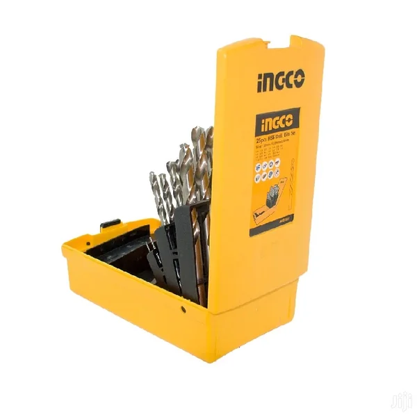 This INGCO AKD1251 set contains 25 high-speed steel twist drill bits, providing a comprehensive range of sizes from 1.0mm to 13.0mm for versatile drilling applications in metal, wood, and plastic.