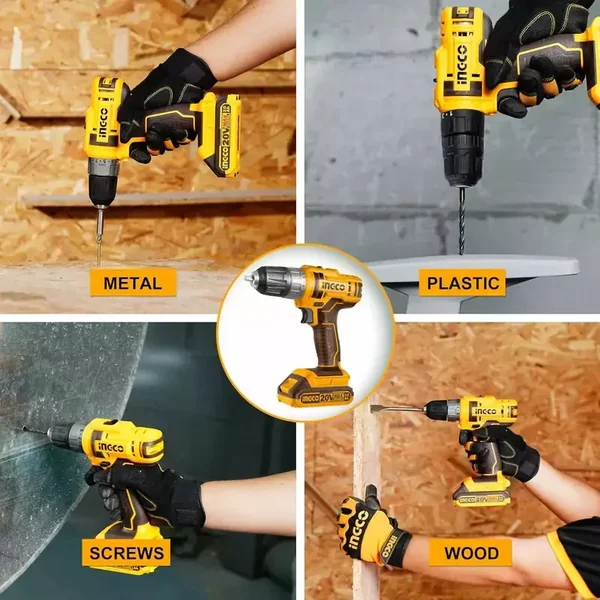 Introducing the versatile Ingco 20V Cordless Drill, engineered for precision and efficiency in a wide range of applications, complete with a comprehensive set of accessories for immediate use.