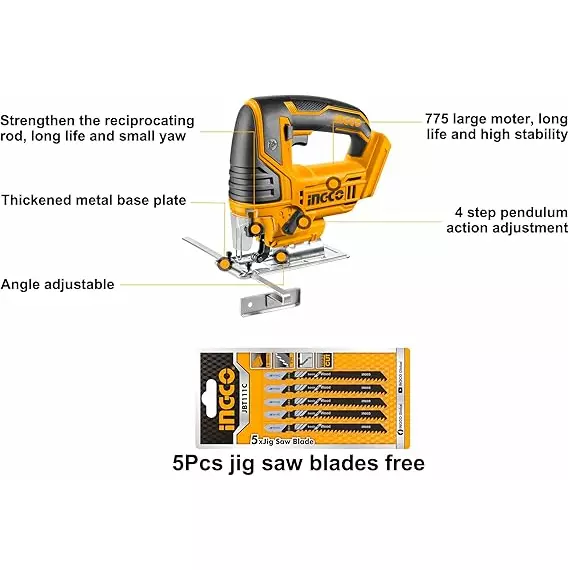 Ingco Lithium-Ion Jig Saw 20v, 2400rpm with 5pcs blades CJSLI8501