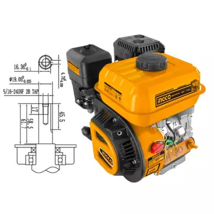 Specification: Max.output:6.5HP Camshaft diameter:19mm, Q type Max.torque:12.4Nm Engine type:4 stroke, OHV Displacement(ml):196 BorexStroke:68X54mm Cooling System: Air-cooled Ignition system: T.C.I Starting system: Recoil Fuel tank(L):3.6L Oil capacity:0.6L Fuel consumption:290g/HP.hr Oil alert function Work as driving motor for water pump, compressor, and other belt driving products Packed by carton box