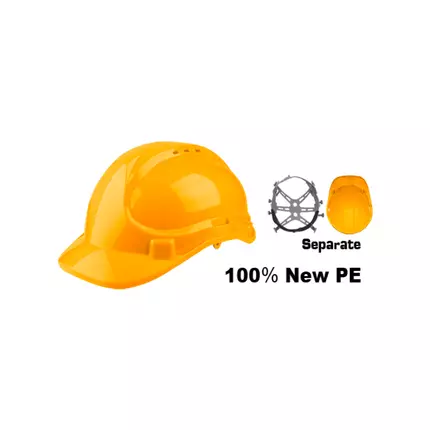 Specifications: PE shell with vents Lining material: Plastic Chin strap included Color:Yellow Weight:330g 8 point suspension Adjust head size by buckle