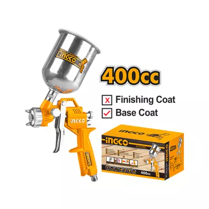 Specifications: Standard nozzle: 1.5mm Pattern width: 180-250mm Paint capacity: 400cc Suitable for base coat With Europe type connector, USA type connector, Nitto type connector and Italy type connector. Optional nozzle: 1.2-1.8mm Operating pressure: 3-4bar Air cons: 4.2-7.1cfm(119-200l/min) Packed by color box