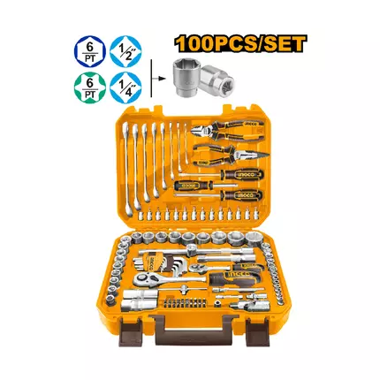 Features: Comprehensive Set: Provides a wide range of tools to handle a variety of tasks, making it suitable for both home and professional use. Durable Construction: Made from high-quality CR-V steel for strength and durability. Specifications: Brand: Ingco Model: HKTHP21001 Type: Tool Box Set 100 Pcs Tools Set 1 Pcs 1/2" ratchet wrench,72T 18Pcs 1/2" Hexagonal Socket: 10-11-12-13-14-15-16-17-18-19-20-21-22-23-24-27-30-32MM 2 Pcs 1/2" Extension bar:125mm (5") / 250mm(10") 1 Pcs 1/2" Dr. Universal joint 2 Pcs Spark plug socket 1/2"Dr.16MM&21MM 1 Pcs 1/2"*3/8" three way adaptor 1 Pcs 1/4" ratchet wrench,72T 13Pcs 1/4" Hexagonal Socket:4-4.5-5-5.5-6-7-8-9-10-11-12-13-14 2 Pcs 1/4" Extension bar:50mm (2") / 100mm(4") 1 Pcs 1/4" sliding "T" bar 1 Pcs 1/4" Dr. Universal joint 8 Pcs Combination spanner:6-8-10-12-14-15-17-19MM 1 Pcs 6" Diagonal Cutting Pliers 1 Pcs 6" Long nose pliers 1 Pcs SL5.5*100 Screwdriver 1 Pcs PH1*100 Screwdriver 14Pcs Bit socket:T10-T15-T20-T25-T27-T30-T35-SL4-SL5.5-SL6.5-PH1-PH2-PZ1-PZ2 9 Pcs Hex key 1.5-2-2.5-3-4-5-6-8-10MM 20 Pcs 1/4" Screwdriver bits SL3,SL4,SL5,SL6,PH0,PH1,PH2,PH3,PZ0,PZ1,PZ2,PZ3,T10,T15,T20,T30,H3,H4,H5,H6 25mm 1Pcs Screwdriver Bits holder 1Pcs 1/4"*150mm Spinner handle Packed by BMC