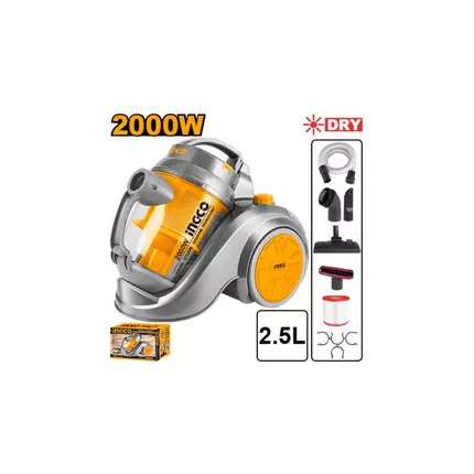 Specifications: Brand: Ingco Model: VC20258 Type: Vacuum Cleaner Voltage:220-240~50/60Hz Input power:2000W Pure copper wire motor Multiple cyclone Suction power:260~330W Spray paint treating the surface Capacity:2.5L HEPA filter Air flow:2.0~2.3 M3/min Vacuum pressure(KPa):≥20 Kpa Product size:433*283*348mm With speed control function With thermo fuse With soft start 1.5m flexible hose 79cm metal telescope tube 1 pcs plastic floor brush 1pcs crevice nozzle 1pcs small round brush 1pcs sofa(upholstery) brush Packed by color box