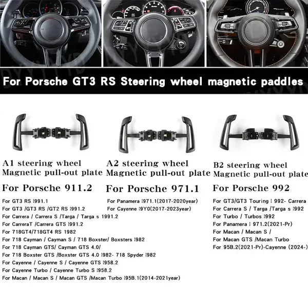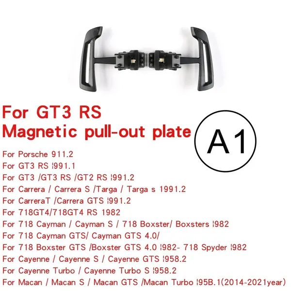 COMPATIBLE WITH PORSCHE 911.2 GT3 RS 991.2/GT3 TT3 RS GT2 RS 991.2/CARRERA CARRERA S TARGA TARGA S 991.2/CARRERA T CARRERA GTS 991.2/ 718 GT4 718 GT4 RS 982/718 CAYMAN GTS CAYMAN GTS 4.0 718 BOXSTER GTS BOXSTER GTS 4.0 982 /718 SPYDER 982/CAYENNE CAYENNE S CAYENNE GTS 958.2/CAYENNE TURBO CAYENNE TURBO S 958.2/MACAN MACAN S MACAN GTS MACAN TURBO 95B.1(2014-2021) INTERIOR STEERING WHEEL MAGNETIC PADDLE SHIFT GEAR SHIFTER PAD A1 RED MARK