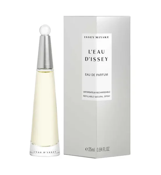 L'Eau d'Issey Eau de Parfum 25ml and 75ml on which are written ""REFILLABLE"" can be refilled with L'Eau d'Issey Eau de Parfum 75ml refill.