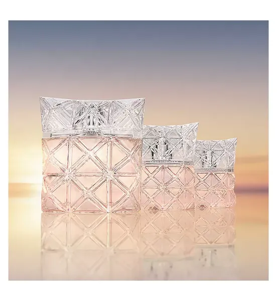 Light refracts through the multi-faceted design, creating an energetic sense of movement. Tinted with the sunrise pink of the perfume within, the refillable transparent bottle — made in France with 15% recycled glass — reveals a luminous purity.
