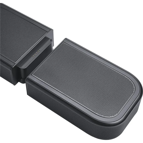 Elevate your 3D surround sound experience with dynamic, immersive height. Four up-firing speakers in the soundbar and wireless rear speakers deliver true Dolby Atmos® sound. No extra wires. No power connections. Just lift the detachable surround speakers off the soundbar—you can do it with just one hand—and place them behind where you want to sit, instantly transforming them into a true surround sound setup. It’s that simple. Whether you’re binge-watching your new favourite show or hosting a movie night, the speakers’ rechargeable long-lasting batteries mean you’ll enjoy immersive, cinematic surround sound for hours. When you’re done, simply place them back on the soundbar to charge overnight.