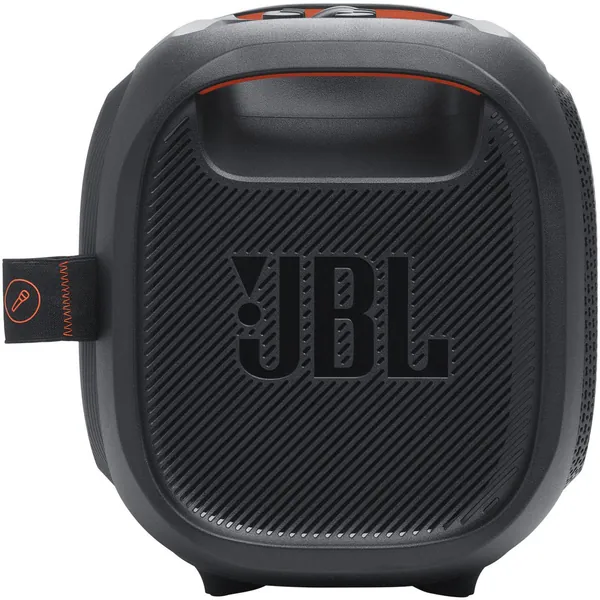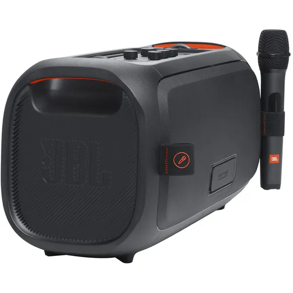The JBL PartyBox On-The-Go Essential comes with a JBL wireless microphone with a range of up to 10 meters.