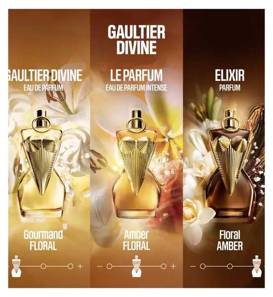 The divine intensity of a floral marine amber elixir With this marine floral amber on her neck, she commands everything. Nobody can resist! Vibrant, captivating and provocative, Gaultier Divine Elixir is intensified with a bold yet creamy tuberose. Uninhibited tonka bean sparks unbridled sensuality Salty notes enhance its exuberance. Such is the infinite power of this uncompromising femininity.