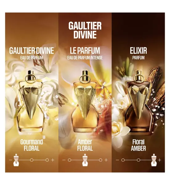 The divine intensity of a floral marine amber elixir With this marine floral amber on her neck, she commands everything. Nobody can resist! Vibrant, captivating and provocative, Gaultier Divine Elixir is intensified with a bold yet creamy tuberose. Uninhibited tonka bean sparks unbridled sensuality Salty notes enhance its exuberance. Such is the infinite power of this uncompromising femininity.