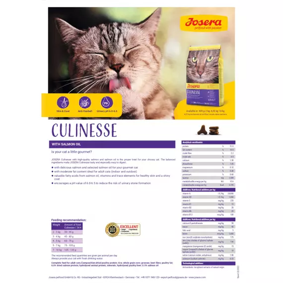 JOSERA Culinesse with high-quality salmon and salmon oil is the proper treat for your choosy cat. The balanced ingredients make JOSERA Culinesse tasty and especially easy to digest.