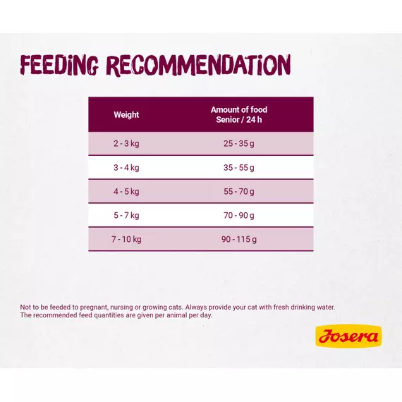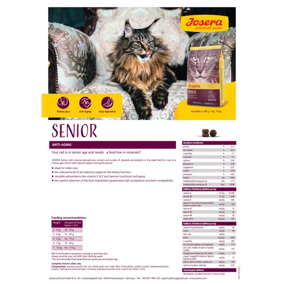 JOSERA Senior with reduced phosphorus content and a plus of valuable antioxidants is the ideal feed for cats at a mature age, which need special support during this period.