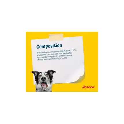 dried poultry protein (poultry 23.0 %, duck 4.0 %), whole grain corn, rice, poultry fat, beet fibre, hydrolysed poultry protein, minerals, ground chicory root (natural source of inulin)