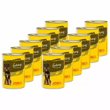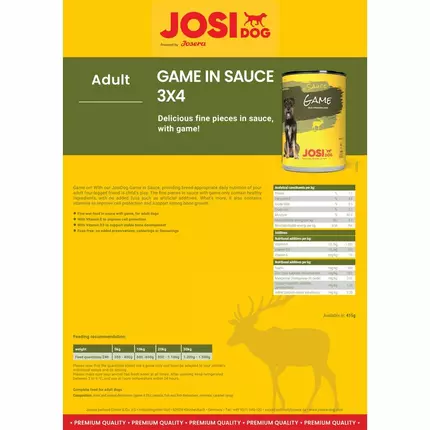 Game on! With our JosiDog Game in Sauce, providing breed-appropriate daily nutrition of your adult four-legged friend is child's play. The fine pieces in sauce with game only contain healthy ingredients, with no added fuss such as artificial additives. What's more, it also contains vitamins to improve cell protection and support strong bone growth.