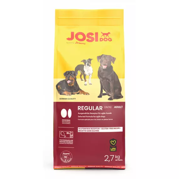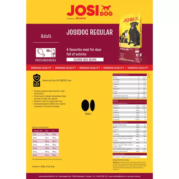 What a guy! Where does your four-legged friend get them from? From our JosiDog Regular dog food! That is because this is the ideal food for dogs with normal, slightly increased energy requirements. The finely tuned gluten-free recipe brings with it all the important nutrients that muzzles need every day. The dry food for adult dogs is also equipped with the LIFE PROTECT seal * - our unique active ingredient to support your dog's fitness and well-being. Of course, we also do not add soy, sugar and dairy products and artificial colors, aromas and preservatives have no place in JosiDog Regular. There is only good in here - really tasty, healthy pet food for every day!