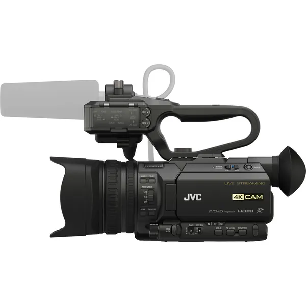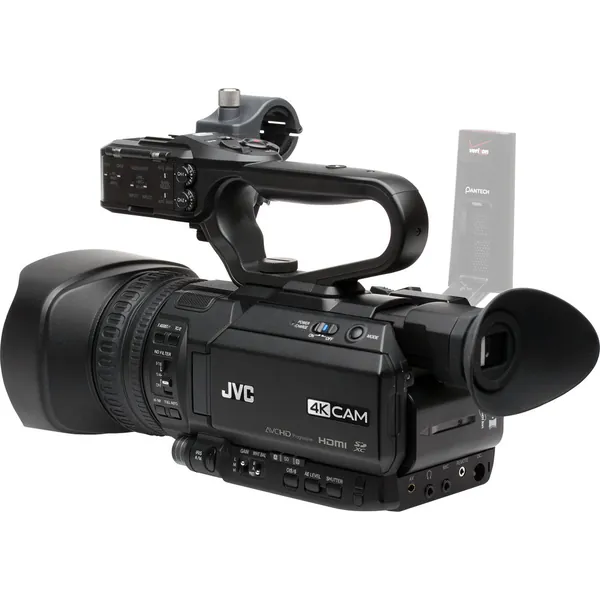 The JVC GY-HM250 UHD 4K Streaming Camcorder with Built-in Lower-Thirds Graphics is a full-featured pro camcorder that enables a single operator to add lower-thirds and titles while recording in HD or streaming—no external character generator or switcher is required. It features a 1/2.3" sensor and captures UHD 4K video at 24/30p, and 4:2:2 4K at 24/30p. This versatile camera offers you the option of recording UHD 4K at rates up to 150 Mb/s to SDXC Class 3 cards or up to 70 Mb/s to SDXC/SDHC Class 10 cards.