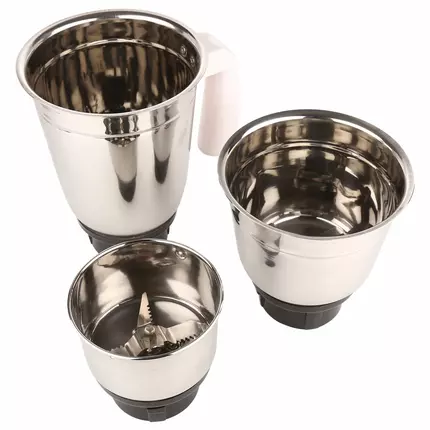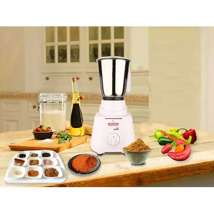 Technical specification: Motor- 500 watts 3 stainless steel jars motor overload protection 1 year warranty on product features: 3 high quality stainless steel jars. Removable aluminum jar base for easy servicing. Superior long lasting busher for smooth operation. Vacuum pads for strong grip. Motor with 100% copper wiring. Superior long lasting busher for smooth operation Vacuum pads for strong grip. Motor with 100% copper winding. 3 high quality stainless steel jars Removable aluminum jar base for easy servicing Package contents: 1 mixer grinder with 3 jars Color: White