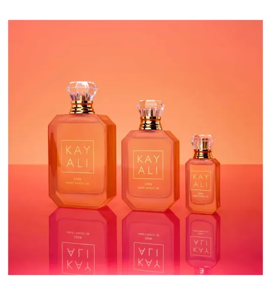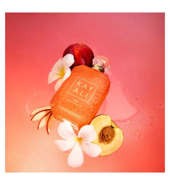 Eden Sweet Peach | 35 comes in a peach-lacquered bottle that mirrors the radiant and juicy nature of the scent within. KAYALI’s signature diamond-shaped bottles and opulent jeweled caps are inspired by traditional Middle Eastern oud bottles. The number 35 indicates the rounds of formulation it took to achieve the perfect juice.