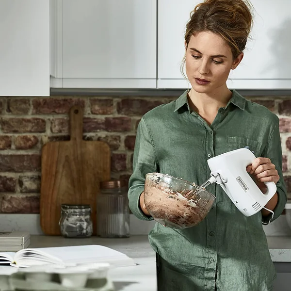 The Kenwood HMP30.AOWH is a powerful 450W hand mixer in a sleek white finish, designed for effortless mixing, beating, and kneading in your kitchen.
