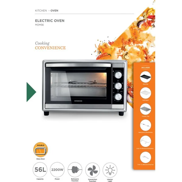 The Kenwood MOM70.000SS is a versatile 70L toaster oven that combines multiple cooking functions in one powerful appliance. With convection heating and a rotisserie, it's designed for grilling, toasting, broiling, baking, and defrosting, making it ideal for preparing a wide variety of meals.