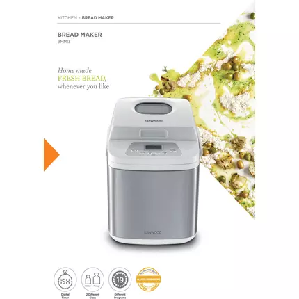 With This Bread Maker You Can Bake A Family-Sized Loaf In About Three Hours. And With 12 Different Baking Programs You Can Bake Just About Any Bread You Like, Including Gluten Free, And Even Use The Machine For Homemade Jams And Marmalade. Bread maker, Recipe Digital Timer 2 Loaf Sizes Possibility To Choose 19 Different Program Prepares Superb Fresh Jams Large Viewing Window To Enable Visibility Of The Baking Process Prepares Mixing For Puddings, Muffins, And Sponge Cake Completely Disassembled For Easy Cleaning The BM250 Bread Maker can be used to bake a 500g, 700g or 1kg loaf - and there are 12 baking programs to choose from. So not only can you use your BM250 to bake a fresh loaf every day, you can try out recipes for specialty breads, including gluten free too. Just use the dough cycle to prepare the dough and then bake in the oven. Or use the pasta dough setting to create your own pasta dishes. You can even use your bread maker to make jams and marmalade. The BM250 can bake a family-sized loaf in under an hour and can be used for savory, sweet, white, whole wheat, French, gluten free and pre-mixed varieties. What's more, you can set baking to start up to 15 hours in advance, so that you can wake up or come home to freshly baked bread, every day. There's a viewing window for you keep an eye on baking progress and an 8-minute power interruption memory, which means you won't have to start all over again should you need to stop the machine part way through the cycle. With the one-hour keep warm function you can keep that just-baked taste for longer. Making simple everyday bread couldn't be easier, add the ingredients, select the program, enjoy your bread! Large, medium or small loaves can be prepared by simply selecting 500g, 750g or 1kg from the menu. Select from the 12 programs, baking bread to suit your tastes, daily bread or something more special can be achieved easily. Features Digital timer 2 Loaf sizes Possibility to choose 19 different programs Prepares superb fresh jams Large viewing window to enable visibility of the baking process Prepares mixing for puddings, muffins and sponge cake Completely disassembled for easy cleaning Specification Brand; Kenwood Model Number: BMM13.000WH Color: White Package Dimensions: 35.4 x 31.8 x 25.6 cm; 4.04 Kilograms Power / Wattage: 1300 watts Material; Plastic Item Weight: 4.04 kg