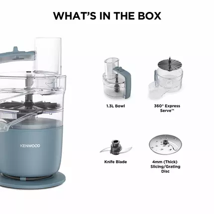 Big ideas start small, that's why with MultiPro Go you can prepare all your favourite recipes without sacrificing on space and performance. This punchy food processor can chop, slice, grate and serve direct to your plate, all within a footprint that's small enough to store on your kitchen worktop or in a drawer. FOOD PROCESSOR: All of your food prep needs covered in a ultra-compact footprint and unique design with Kenwood MultiPro Go FDP22.130GY PREPARE DELICIOUS DISHES: Use this food processor for different preparations. It is great for chopping, slicing, grating, pureeing and even kneading dough. From salsa and snacks to pizza dough, it has powerful versatility ULTRA COMPACT DESIGN: It is always ready to go and stores in your kitchen drawer CAPACITY: 0.75L main bowl liquid working capacity FUNCTIONS: This food processor includes 1 speed and pulse function. It has 4 attachments including: express serve - limitless slicing grating direct to your plate/pan, 1.3L bowl, knife blade, 4mm slicing/grating disk Brand Kenwood Model Number FDP22.130GY Colour Grey Product Dimensions 15.8 x 15.8 x 29.7 cm; 1.94 kg Number of Speeds 1 Special Features Adjustable Speed Control Item Weight 1.94 kg 360 Express Serve™ SLICE AND GRATE DIRECT TO THE PLATE Save time with the Express Serve™ attachment. It's perfect for limitless grating and slicing directly onto a serving dish or into a pan - keeping the main bowl clean so you can save on washing up. 30cm tall ULTRA-COMPACT FOR IN DRAWER STORAGE Compact with no complex assembly, easily store on your kitchen worktop, or in a drawer. Always ready to go STACK 'N' STORE All your food prep in one place. No fuss, no clutter. 650W motor POWER AND PRECISION From salsa and snacks to pizza dough, this food processor packs a punch. Chop, slice, grate, purée and even make dough, MultiPro Go has the power to handle it all. Key Features Easy to use Simple sliding speed control conveniently positioned in the handle, with 2 speeds including a pulse function. Limitless Capacity Unleash your food prep potential with limitless Express Serve™ capacity. Plus a compact 1.3L bowl with 0.75L working capacity for everyday chopping. Slice and grate Slice like a kitchen knife and grate like a grater with the MultiPro Go slice and grate disc. Simply drop it on to slice fruit and vegetables or flip it over to grate cheese - the perfect space shaving disc.