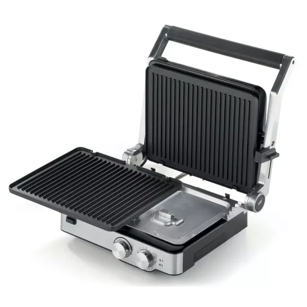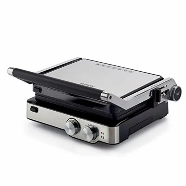 The Kenwood HGM80.000SS Grill is a versatile 2000W countertop appliance designed for healthy, efficient cooking. It functions as a contact grill, panini press, and flat grill, allowing you to prepare a wide variety of foods like paninis, burgers, steaks, and vegetables with adjustable temperature and timer control for perfect results every time.
